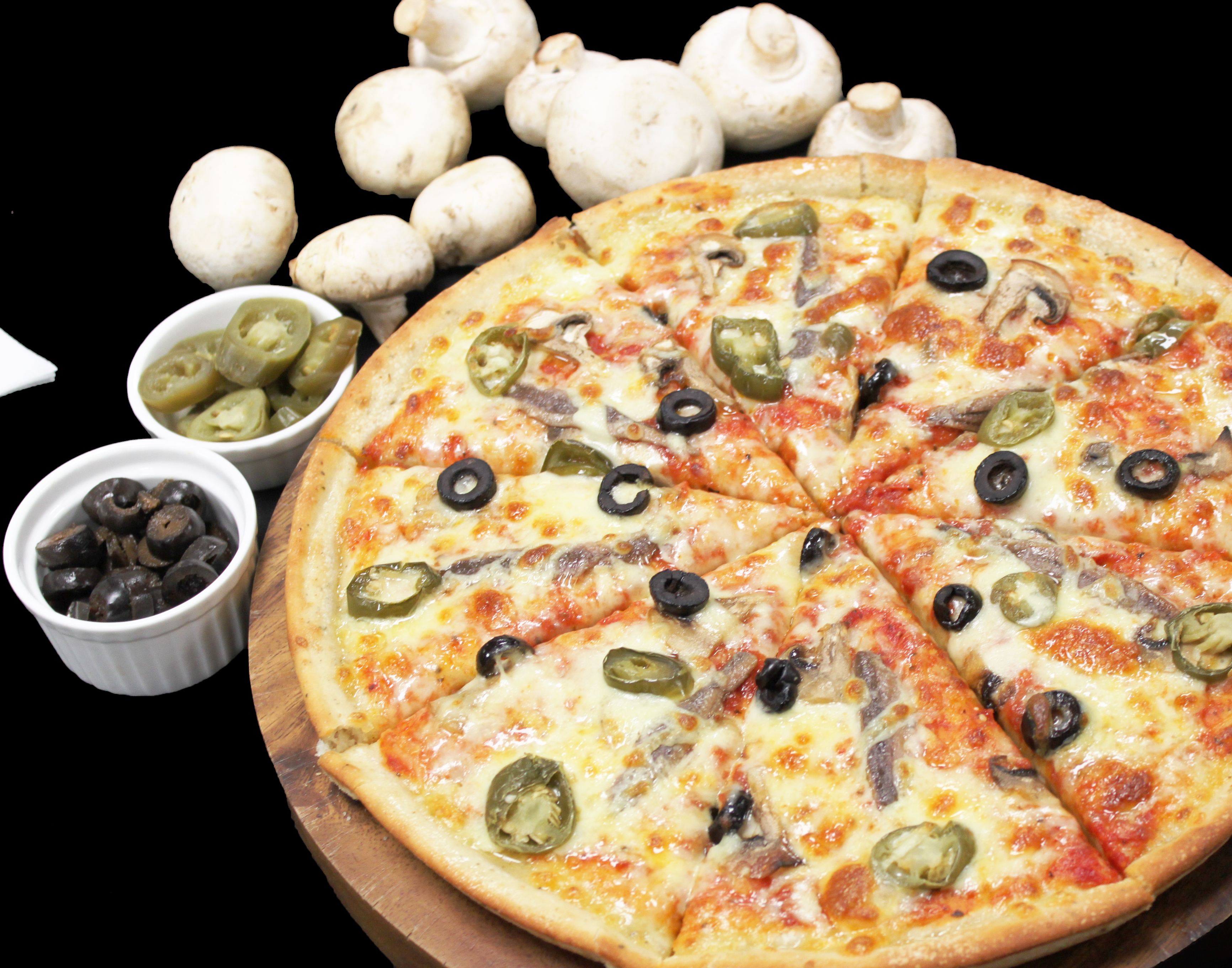 Chef’s Special Sauce, Mozzarella Cheese, Mushrooms, Olives, Jalapenos, Anchovies, Hollandaise Sauce.